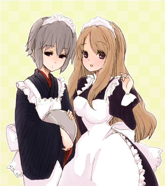 00s2girlsapronbowbreastsbrown eyesflat chestfrillsgrey hairholdingjapanese clotheslarge breastslong hairlong sleevesmaidmaid apronmaid headdressmixed maidsmultiple girlsorange hairshort hairsleeves past wristssmilewa maid