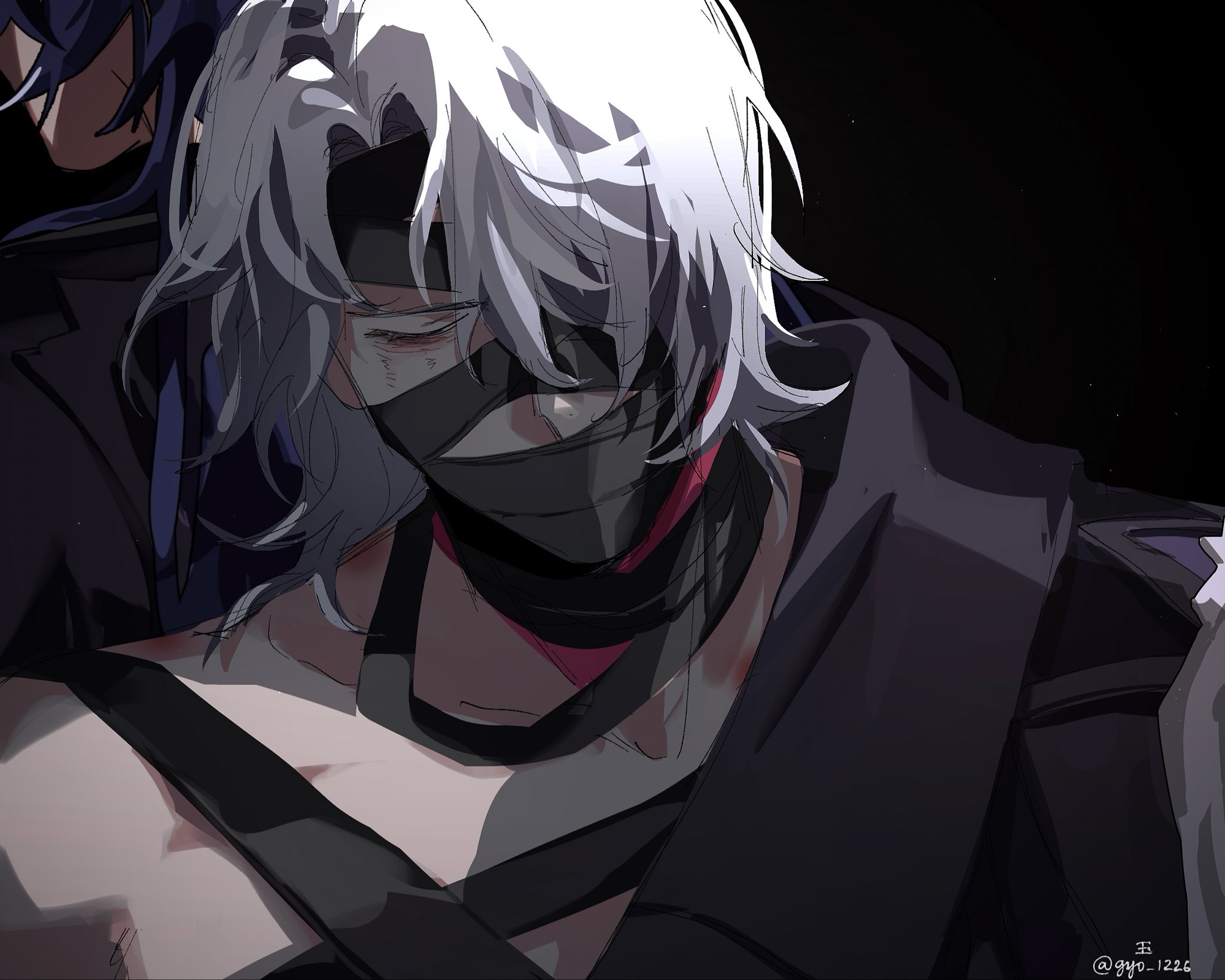 2boysbandaged headbandagesblack backgroundblack shirtblue hairclosed eyescovered mouthgyo 1226long hairmale focusmultiple boysone eye coveredparted hairshirttwitter usernameupper bodywhite hair