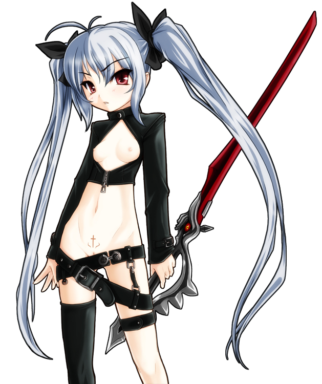 1girlasymmetrical clothesbeltbreastsfemale focuslolilong hairmidriffopen clothespussypussy peekred eyessingle thighhighsmall breastssoloswordthighhighstwintailsweapon