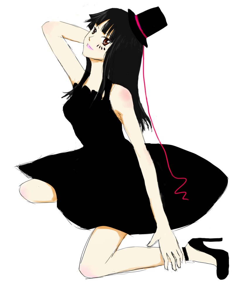 00s1girlblack hairbrown eyesdressfemale focushathigh heelslipsticklong hairmakeupmini hatmini top hatno legwearshoessolotop hat