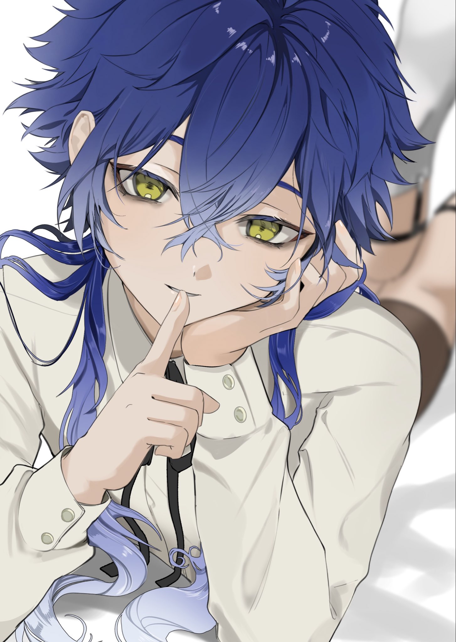 1boyaged downarm supportblack ribbonblue hairblurryblurry backgroundbrown shortsclosed mouthfinger to mouthgreen eyeshand on own cheekhand on own facelong hairlooking at viewerlyingmale focusneck ribbonon stomachribbonshirtshortsshushingsimple backgroundsockssoloupper bodywhite backgroundwhite shirtwhite socks