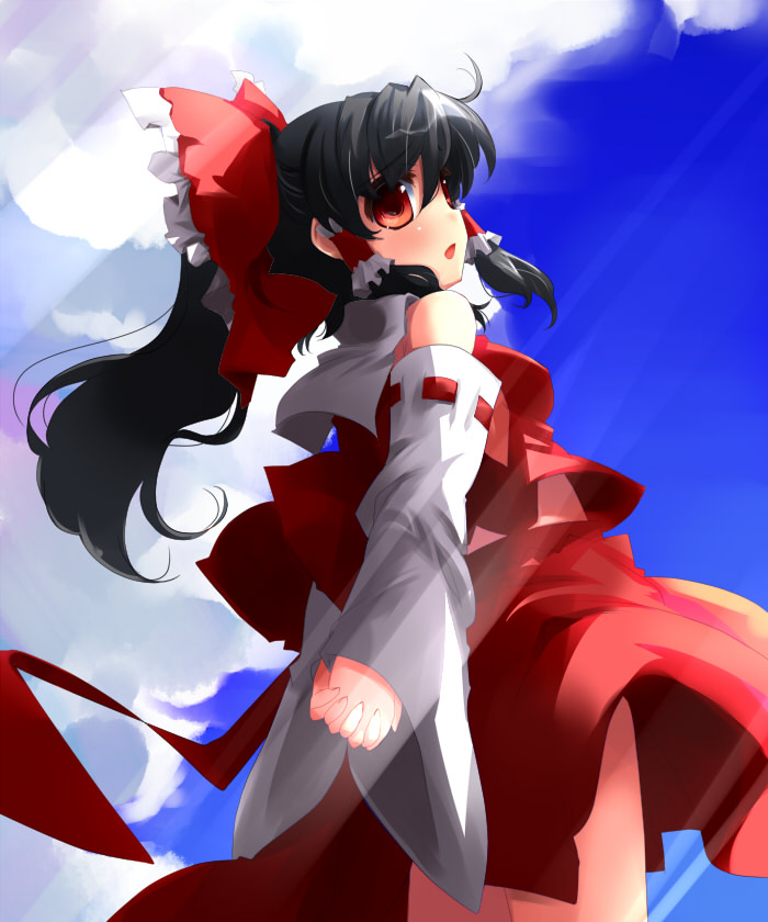 1girlarms behind backblack hairbrown eyesclouddayfemale focusinterlocked fingersjapanese clotheslight raysmikoribbonskysolosunbeamsunlight