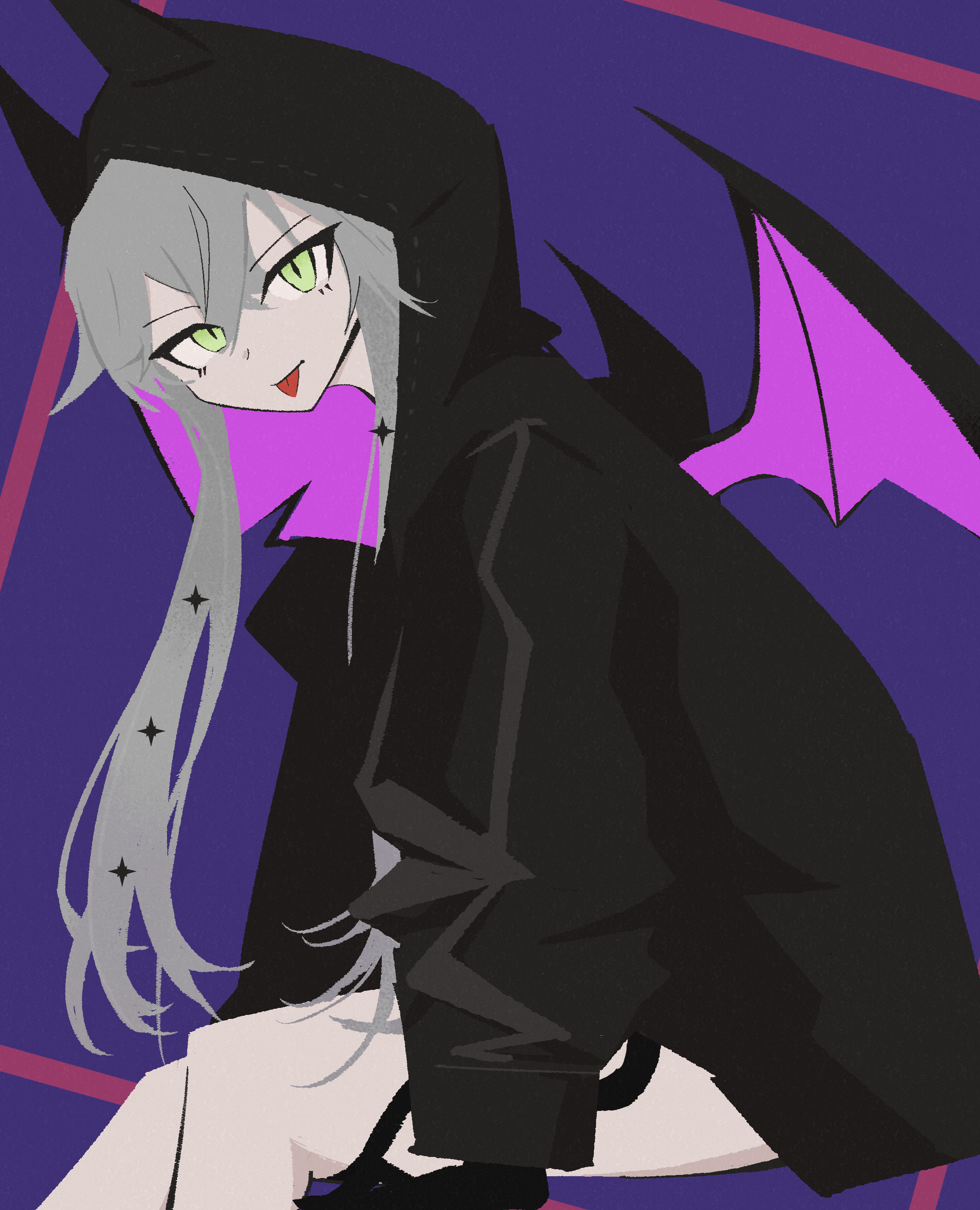 1girlbat wingsgreen eyeshoodhoodielong hairlooking at viewernew3kin 333solotonguetongue outtwintailswhite hairwings