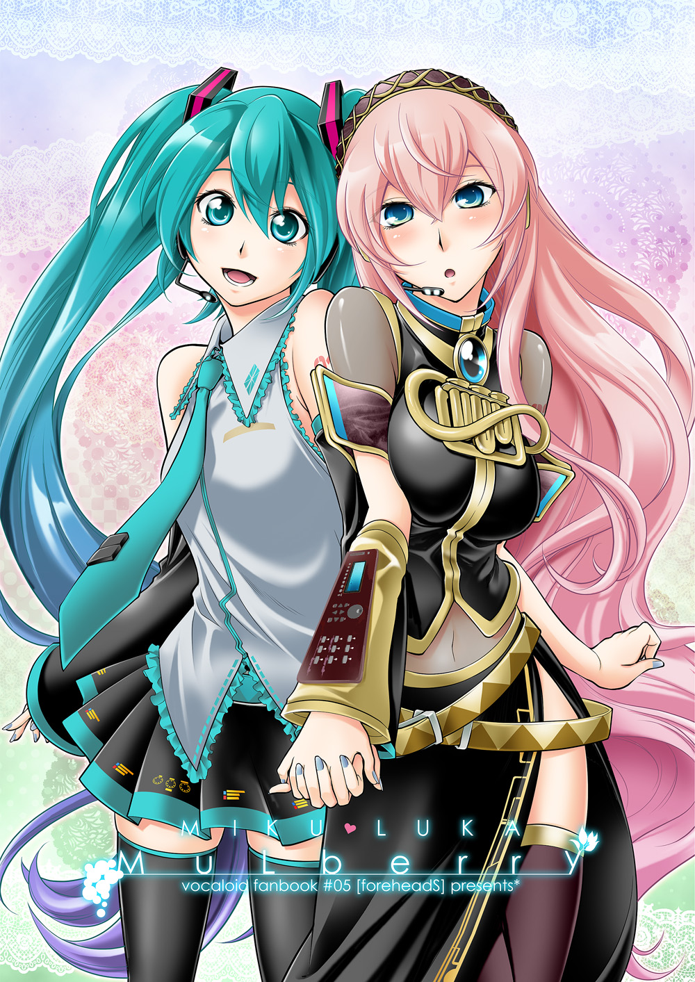 2girlsblue eyesblue hairblue nailsblushdetached sleeveshappyheartholding handslong hairmultiple girlsnail polishnecktiepink hairside slitskirtthighhighstwintailsvery long hairzettai ryouiki