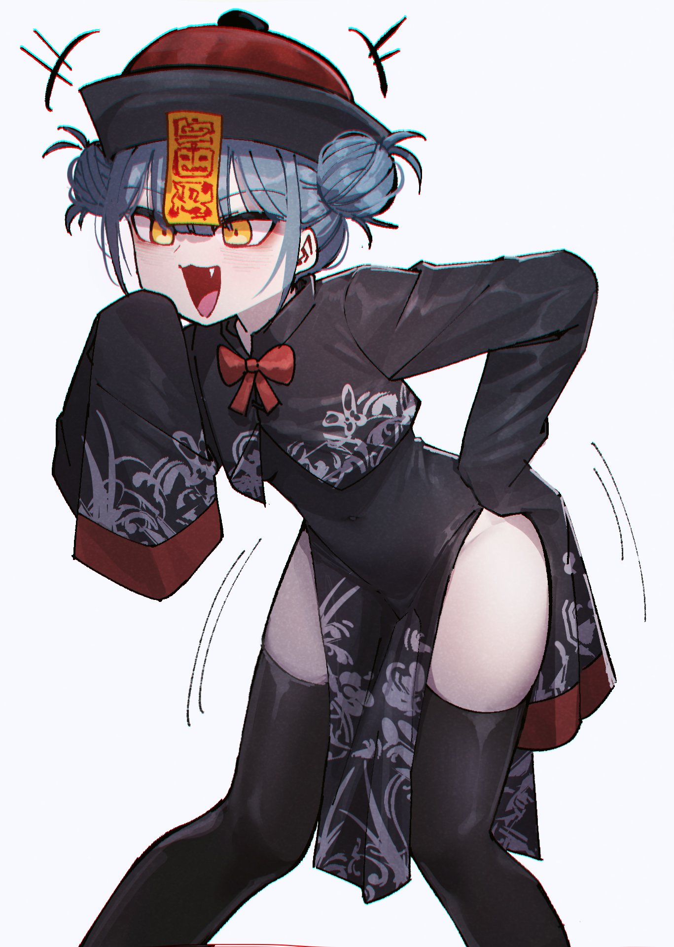 :31girlblack dressblack shirtblack thighhighsbowbowtiebreastscovered navelcropped shirtdonut hair bundressfanghair bunhand on own hiphand to own mouthhatjiangshijiangshi costumelong sleevesmotion linesofudaofuda on headonto3287open mouthpelvic curtainpurple hairqingdai guanmaored bowred bowtiered hatshirtsleeves past fingerssleeves past wristssmall breastssmilesolothighhighsthighsyellow eyes