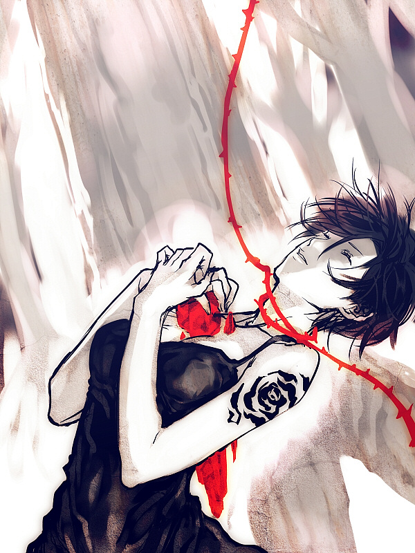 1girlbreastsbrown haircleavageclosed eyesdressfemale focusflowerforest of moralmonochromeroseshort hairsolospot colortattoo