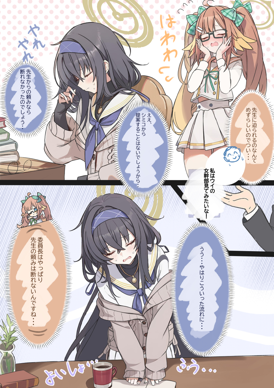 1boy2girlsblack hairblack-framed eyewearblue hairbandblue neckerchiefblushbowbrown cardiganbrown halocardiganclosed eyescoffeecupgreen bowhair bowhairbandhalolong hairlow twintailsmultiple girlsneckerchiefopen mouthorange hairorange sailor collarplantsailor collarschool uniformserafukushirtskirtspeech bubbletwintailswhite sailor collarwhite shirtwhite skirt