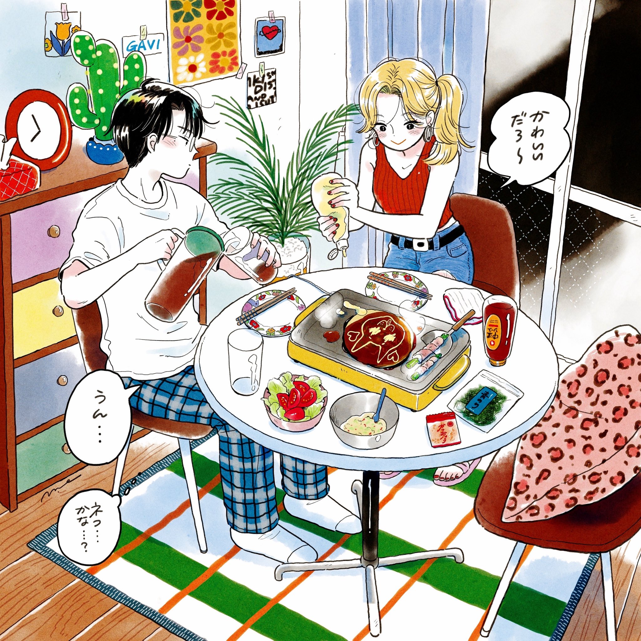 1boy1girlanimal printapartmentbare shouldersbeltblack eyesblack hairblonde hairblushbowlcactuschairchest of drawerschopsticksclockclosed mouthcollarbonecolored skincupcurtained hairdenimearringsfingernailsfloral printflowerfoodfull bodyglassesholdinghoop earringsiridescent hairjeansjewelryleopard printlooking at foodmayonnaisenail polishokonomiyakipajamaspantsparted bangsplaid clothesplaid pantsplantplatered nailsred tank topround eyewearrugsaladsandalsseaweedshirtshort hairshort sleevesside ponytailsignaturesittingslice of lifesliding doorssmilesocksspeech bubblestandingt-shirttank toptapetissue boxtoenail polishtoenailswhite shirtwhite skinwooden floor