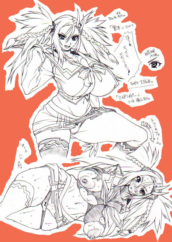1girlblushbraidbreastshuge breastsmonochromenavelnipplesorange backgroundpantiessketchskirtthick thighsthighhighsthighstorn clothestwin braidsunderwearwide hips