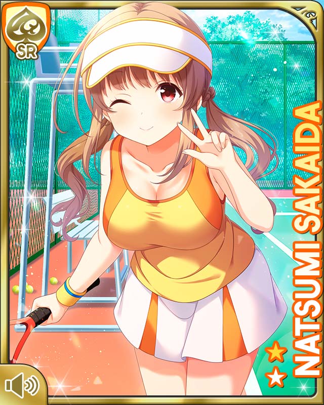 1girlbreastsbrown hairc:card (medium)character nameclosed mouthdayfemale focushair ornamentlarge breastslong hairlooking at viewerorange shirtoutdoorsracketred eyesscrunchieshirtskirtsmilesolosparklesportswearstandingtank toptennis courttennis rackettennis uniformthighhighsvwhite skirtwhite thighhighs