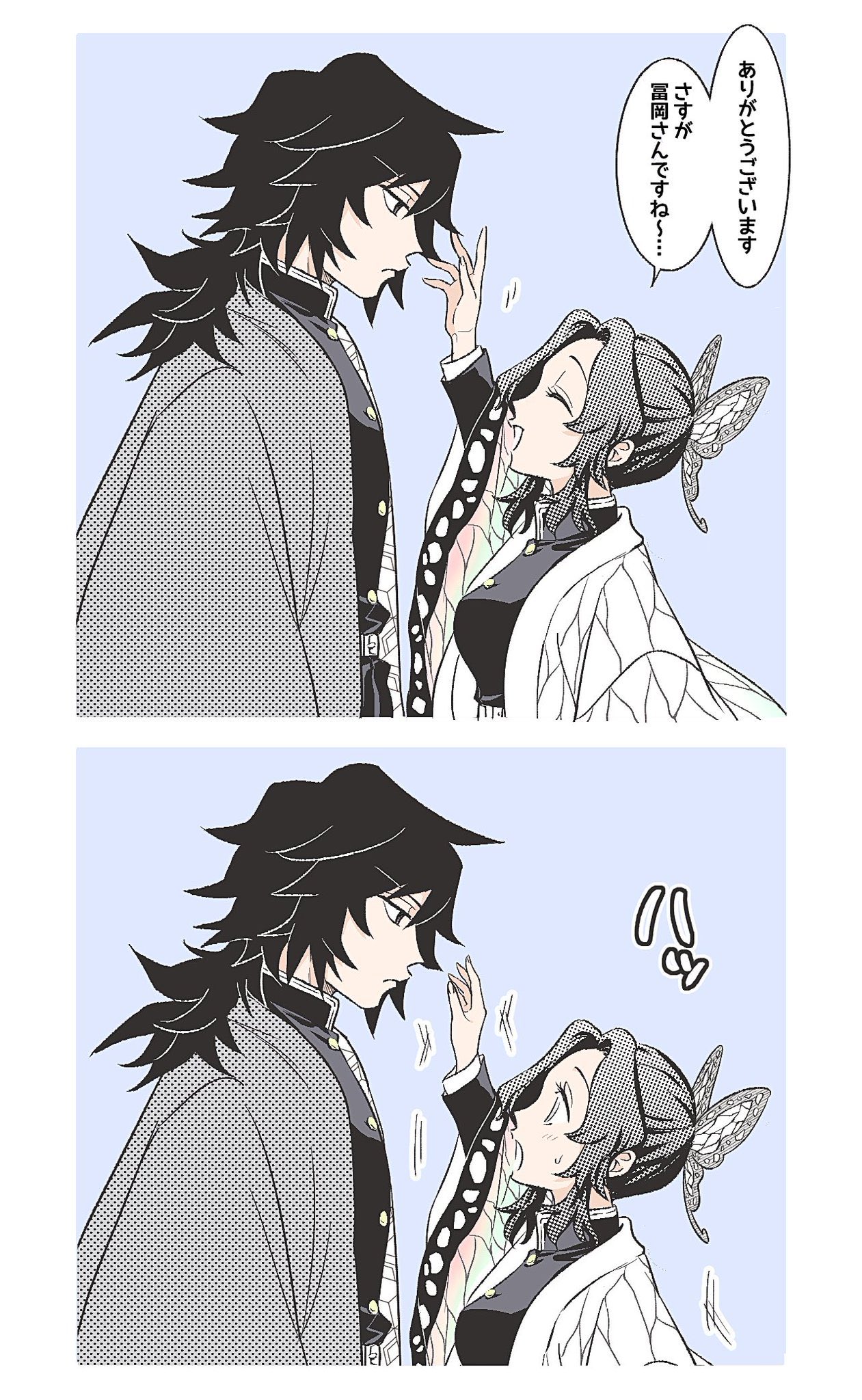 1boy1girlanimal printblack hairblack jacketblue backgroundborderbreastsbutterfly hair ornamentbutterfly printbutterfly print haoriclosed eyesdemon slayer uniformfrownhair between eyeshair ornamenthand uphaorijacketjapanese clotheslong hairlooking at anothermedium breastsninmariopen mouthparted bangsprint haorisidelockssmilesweatdropupdoupper bodywhite border