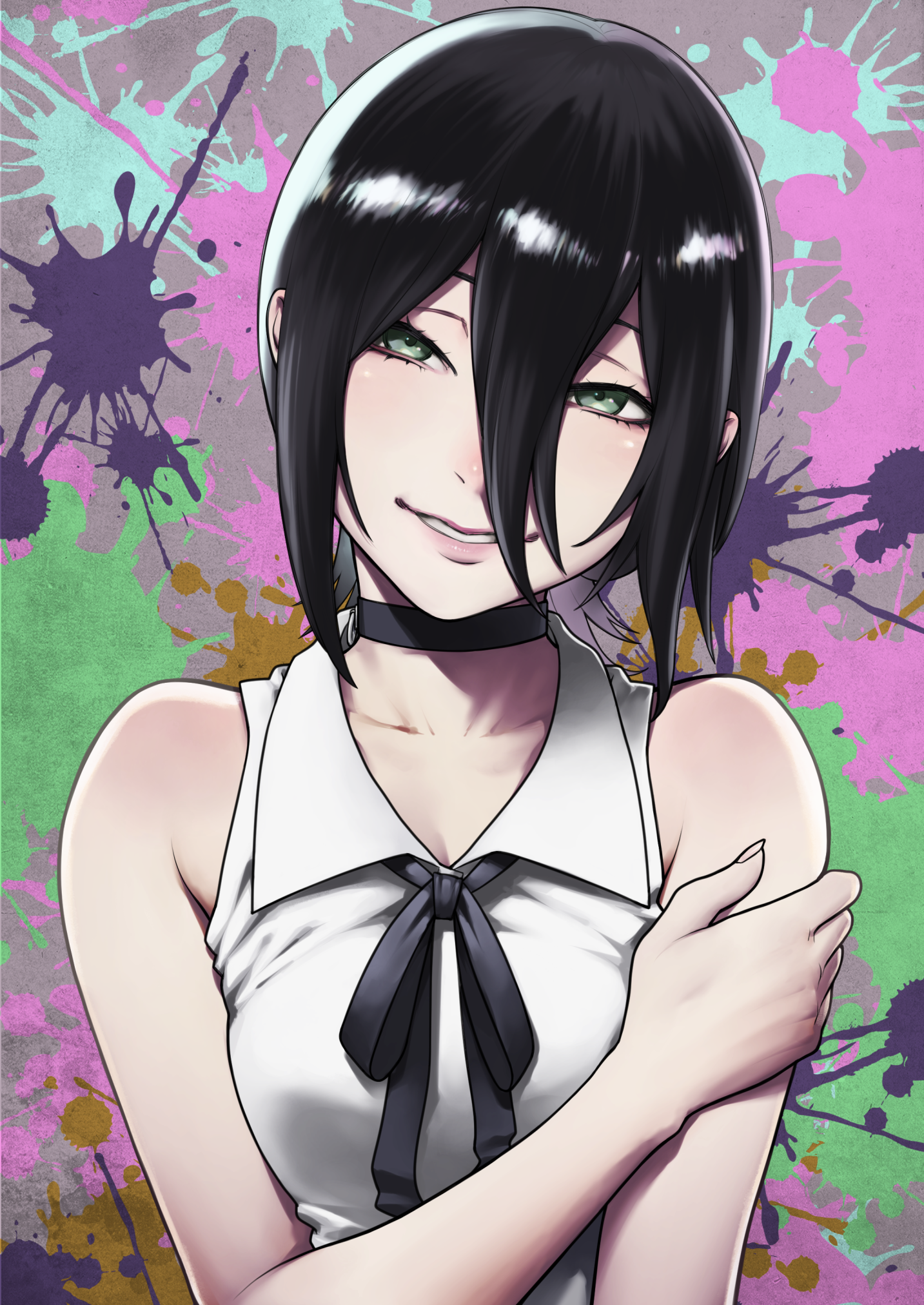 1girlblack chokerblack hairblack ribbonchokercollared shirtgrenade pinhair between eyeslooking at viewerneck ribbonpaint splatterribbonshirtsleevelesssleeveless shirtsolowhite shirt