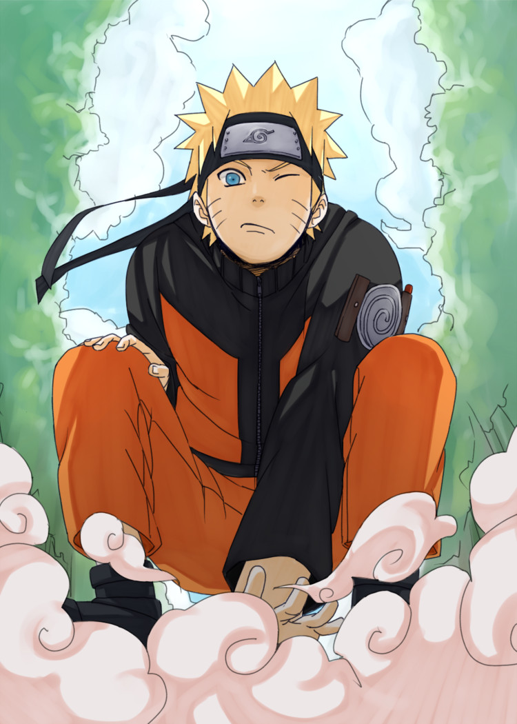 1boyblack headbandblack shoesblue eyesblushcloudfacial markforehead protectorfrom belowfrownfull bodyheadbandkonohagakure symbolmale focusone eye closedshoessmokesolosquattingwhisker markings
