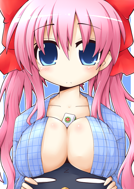 00s1girlbirdblue eyesboard gamebreast restbreastsbreasts on headcleavagefemale focuslarge breastsmahjongpenguinpink hairsolo