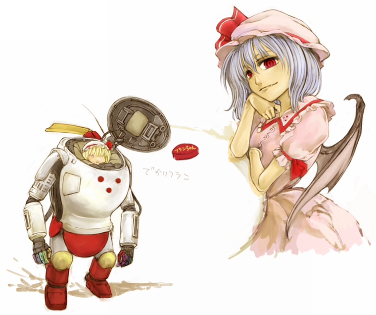 2girlsbat wingsblonde hairblue hairfemale focushatmechamultiple girlsred eyesrobotshort hairsiblingssistersvampirewings