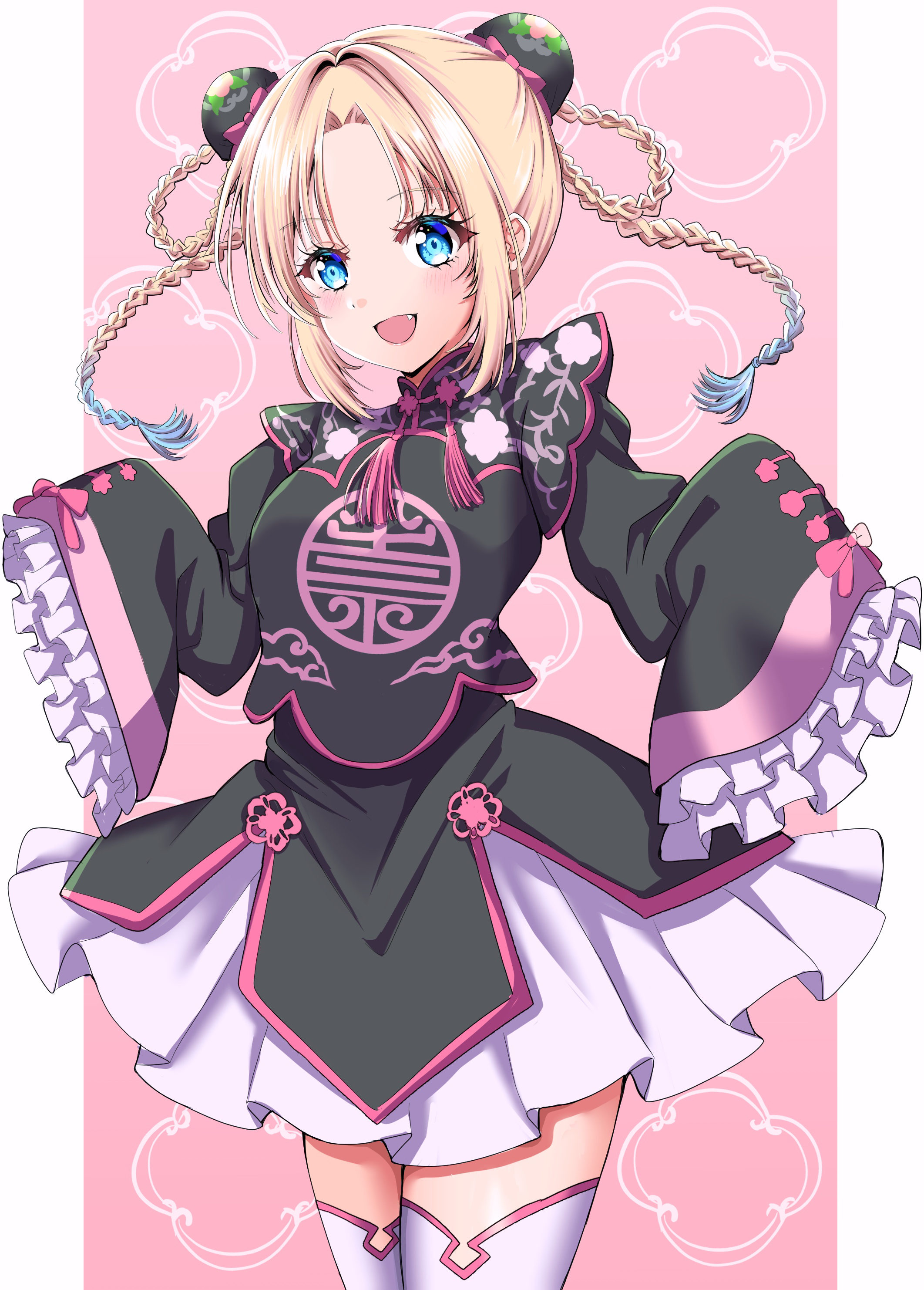 :d1girlblack shirtblack skirtblonde hairblue hairbraidbraided hair ringsbreastsbun coverchinese clothescowboy shotdouble bunfangfloating hairfrilled sleevesfrillsgradient backgroundgradient hairhair bunhair ringshasu no sora pop up shop china collectionlong hairlong sleeveslooking at viewermedium breastsminiskirtmulticolored hairopen mouthoverskirtparted bangspillarboxedpink backgroundpurple skirtshirtskirtsleeves past fingerssleeves past wristssmilesolostandingtasselthighhighstwin braidsvirtual youtuberwhite thighhighs