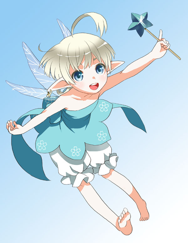 1girlahogebarefootblonde hairbloomersblue eyesearringsfairyfeetfemale focusflat chestgradient backgroundjewelryopen mouthpointy earsshort hairsolessolotoesunderwearwandwings