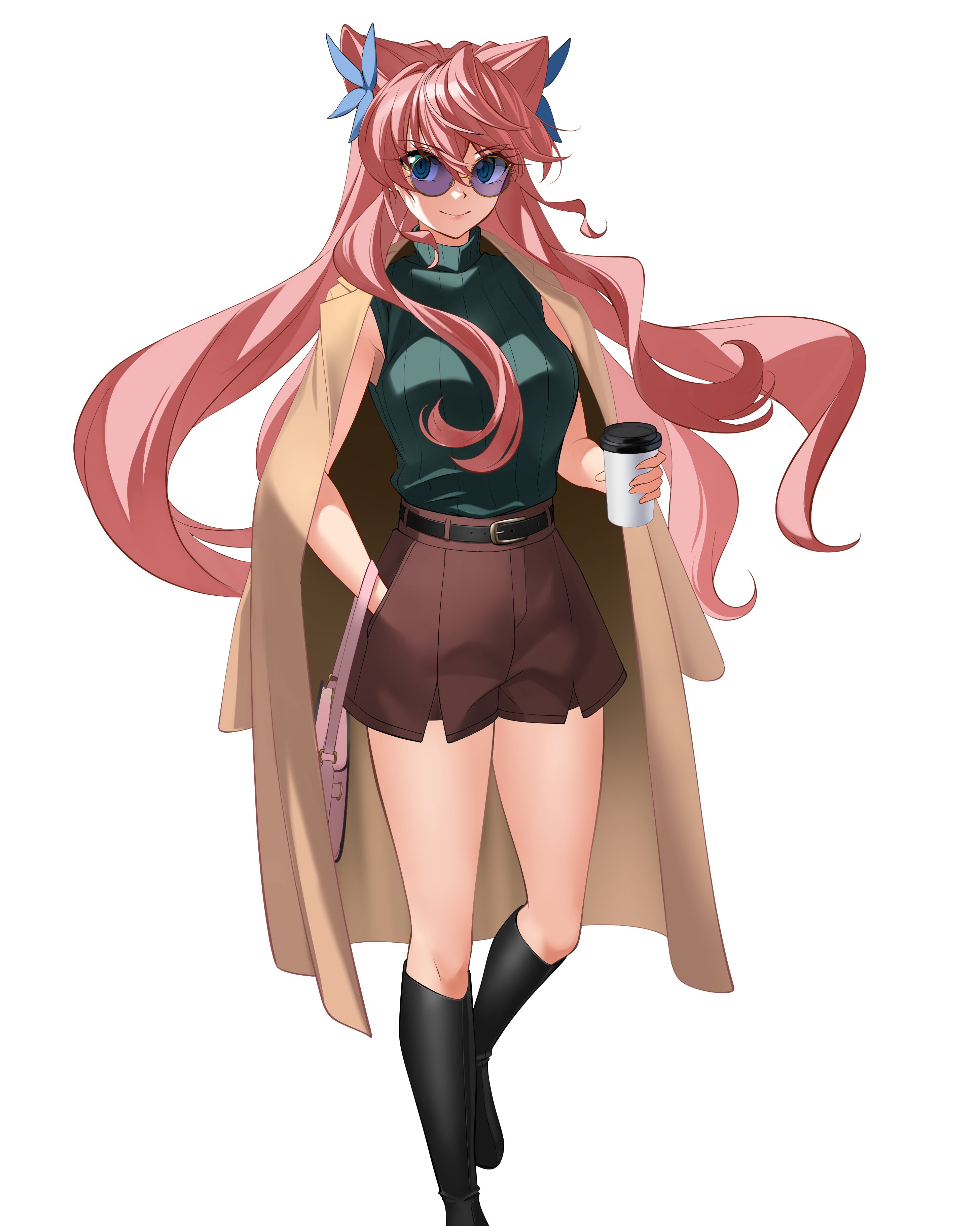 asakura karen (heaven burns red), heaven burns red, highres, 1girl, animal, animal hood, animal on head, black hair, breasts, cleavage, collarbone, hood, hood up, long hair, long sleeves, mii hvbn, on head, solo, tail, yellow eyes