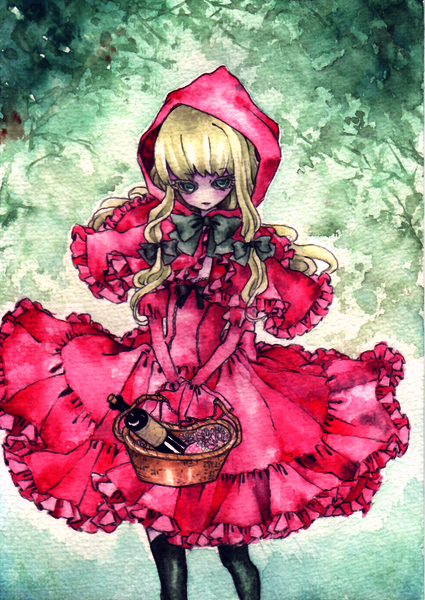 1girlalcoholbasketblonde hairfemale focusgreen eyeshair ribbonhoodribbonshort hairsolothighhighswine