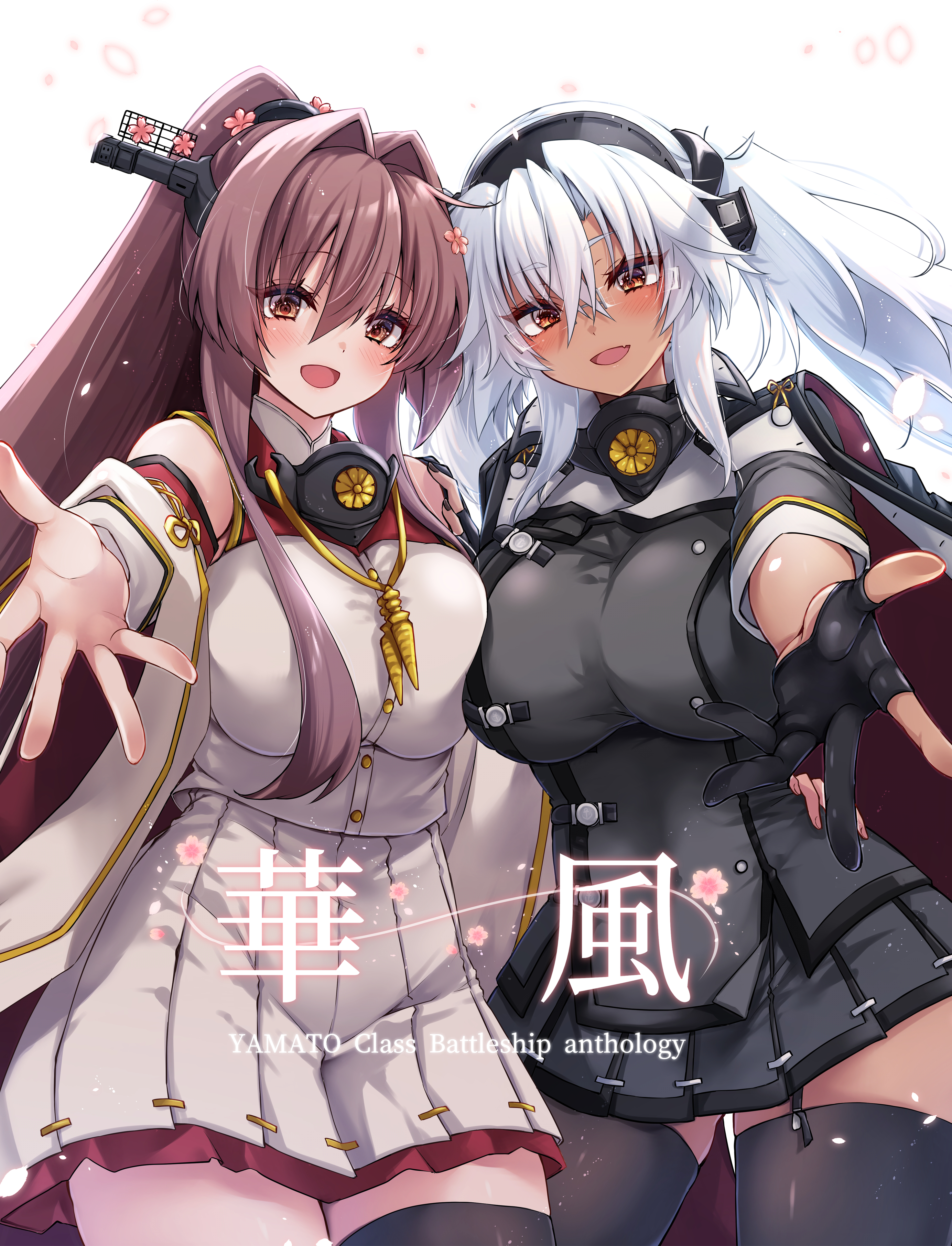 2girlsblack nailsblack thighhighsblushbreast pressbreastsbrown eyesbrown haircherry blossomscoatcollarcoverdark skindark-skinned femaleflowerglassesglovesgrey hairhair between eyeshair flowerhair ornamentheadgearlarge breastslong hairlooking at viewermetal collarmultiple girlsopen mouthpartially fingerless glovespointy hairponytailred eyesrimless eyewearsakuramonsemi-rimless eyewearskirtsleevelesssleeveless coatsmilethighhighstwintailsvery long hairwhite coatwhite hairwhite skirt