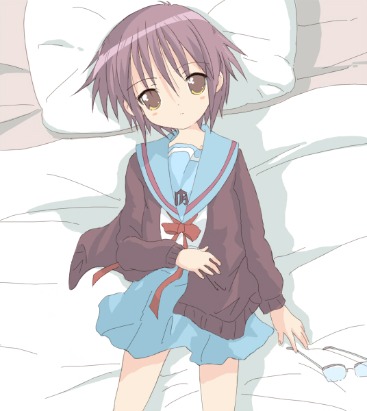 00s1girlbrown eyesbrown haircardiganfemale focusglasseslyingpillowpurple hairschool uniformserafukushort hairsoloyellow eyes