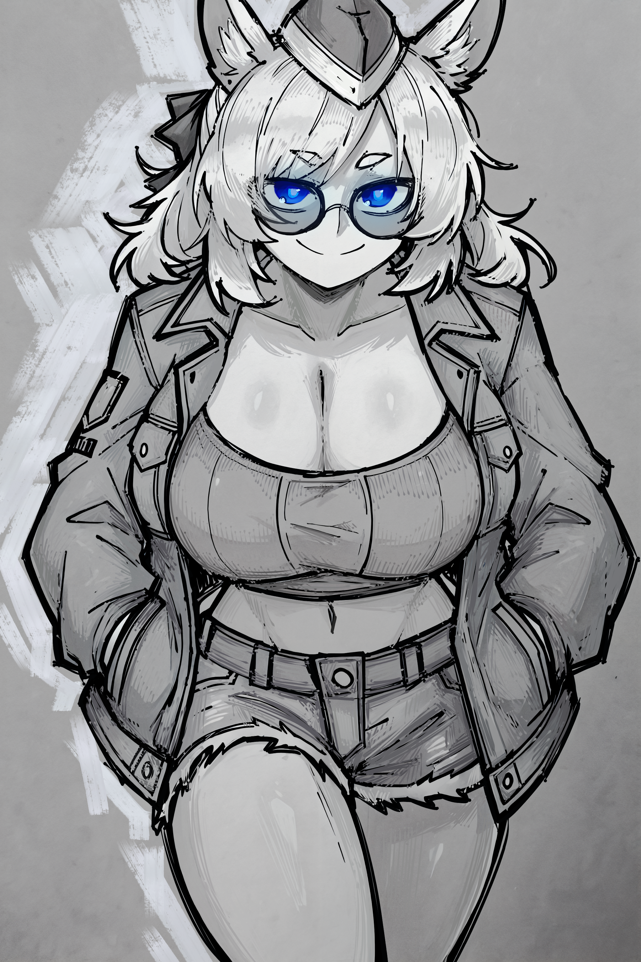 1girlanimal ear fluffanimal earsblue eyesbreastscleavageclosed mouthcollarbonecowboy shotgreyscalegroinhands in pocketshatjacketlarge breastslong sleevesmedium hairmonochromenavelopen clothesopen jacketshort shortsshortssmilesolosplit mouthspot colorstanding