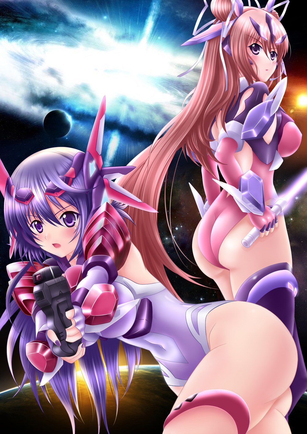 park ppaeng i, makiatto (girls' frontline 2), wa2000 (girls' frontline), girls' frontline, girls' frontline 2: exilium, absurdres, commentary request, highres, korean commentary, 1girl, alternate costume, animal ear hairband, animal ears, arm up, ass, black bow, black bowtie, black leotard, black pantyhose, black shoes, bow, bowtie, breasts, detached collar, fake animal ears, fake tail, from side, full body, hair ribbon, hairband, high heels, large breasts, leotard, long hair, looking at viewer, open mouth, pantyhose, playboy bunny, ponytail, purple hair, rabbit ears, rabbit tail, red ribbon, ribbon, shoes, simple background, solo, standing, strapless, strapless leotard, tail, white background, white wrist cuffs, wrist cuffs