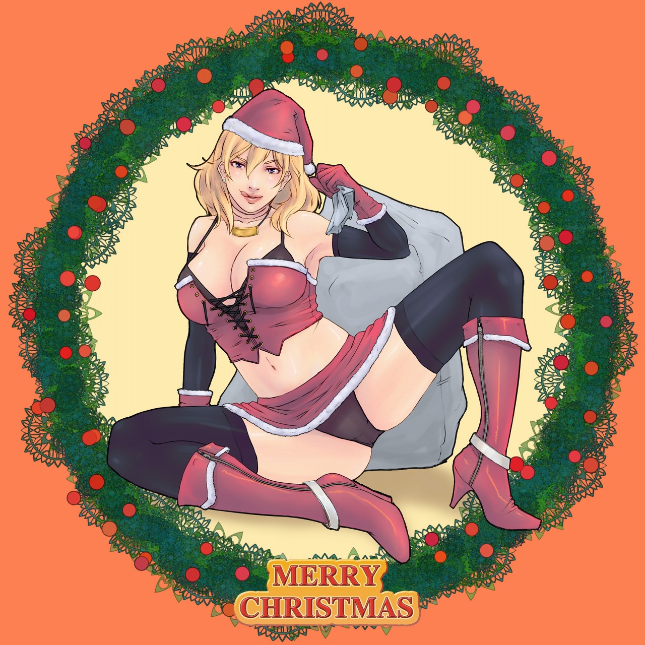 :qblonde hairbootsbreastschristmascleavagehatlarge breastsmidriffpantiespurple eyessanta costumesanta hatsolothighhighstonguetongue outunderwearzipper