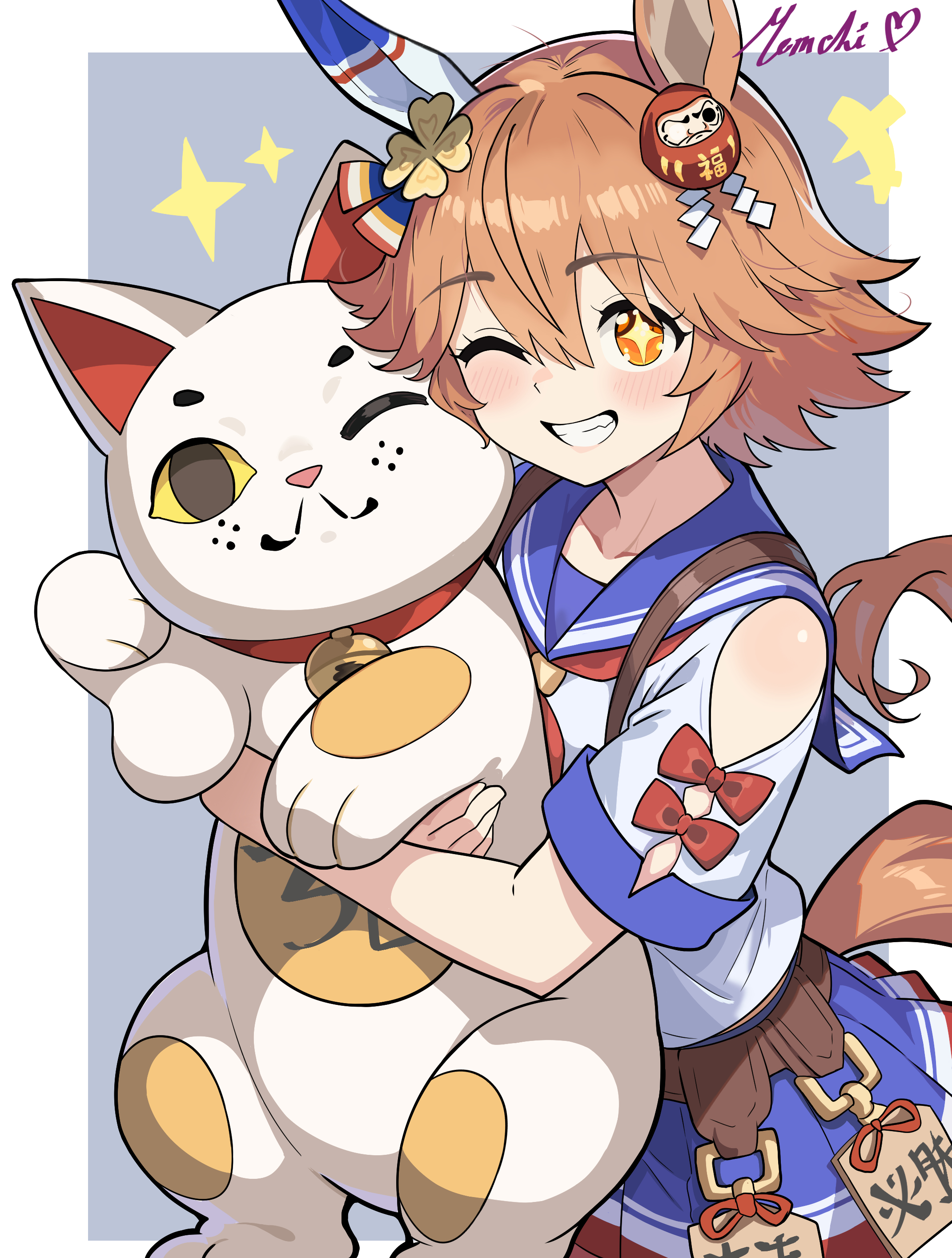 1girlanimal earsbead braceletbeadsblue skirtbraceletclover hair ornamentdaruma dolldaruma doll hair ornamentdoll hair ornamentear coversflipped hairfour-leaf clover hair ornamentgood fortune symbolhair between eyeshair ornamenthorse earshorse girlhorse tailjewelrymaneki-nekomem chineckerchieforange hairred neckerchiefsailor collarschool uniformserafukushirtshort hairsingle ear coverskirtsmilesolostar (symbol)star-shaped pupilssymbol-shaped pupilstailwhite shirt