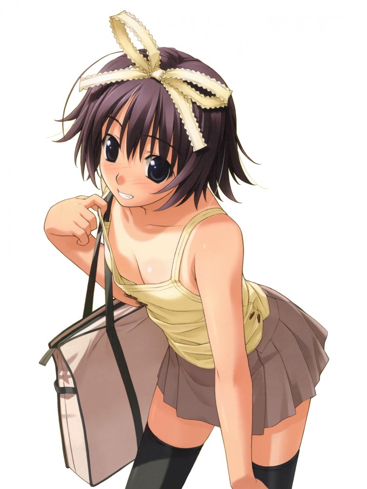 1girlbagblack thighhighsblue eyesblushbowbreastscamisolecleavagedolphindownblousefemale focusflat chestgrinhair ribbonleaning forwardminiskirtone-piece tanpleated skirtpurple hairribbonshort hairskirtsmall breastssmilesolotantanlinethighhighszettai ryouiki