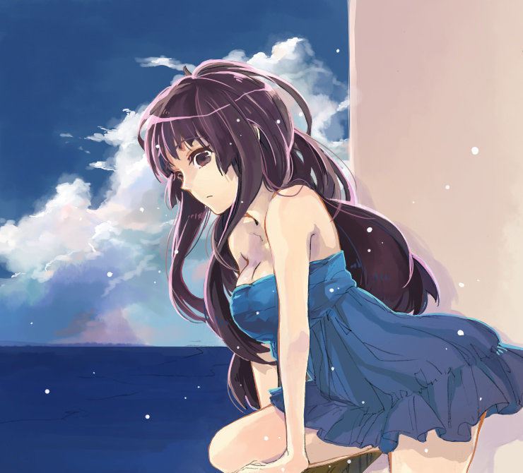 00s1girlblack hairblunt bangsbreastsbrown eyescleavageclouddaydressfemale focushime cutlarge breastslong hairoceansolostraplessstrapless dresssundresswater