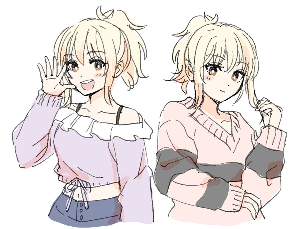 :d1girlbare shouldersblonde hairbrown eyesclosed mouthfrilled shirtfrillslooking at viewermedium hairmidriffmultiple viewsnaveloff shoulderoff-shoulder shirtofficial alternate costumeopen mouthpink sweaterponytailpurple shirtshirtsidelockssimple backgroundsmilestrapstriped clothesstriped sweatersweaterteethupper teeth onlyv-neckwhite background