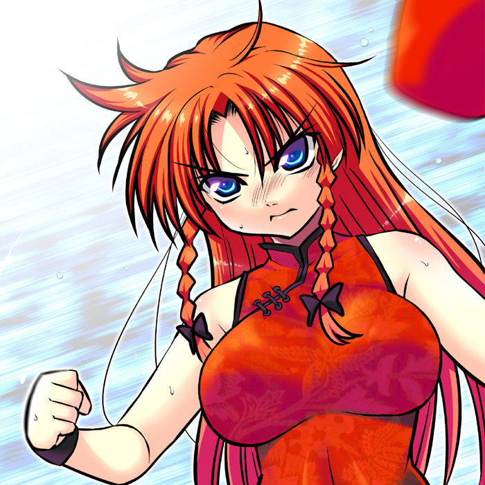 1girlangrybare shouldersblue eyesbraidbreastschina dresschinese clothesdressfemale focusglaringlarge breastslong hairno headwearred hairsolotwin braids