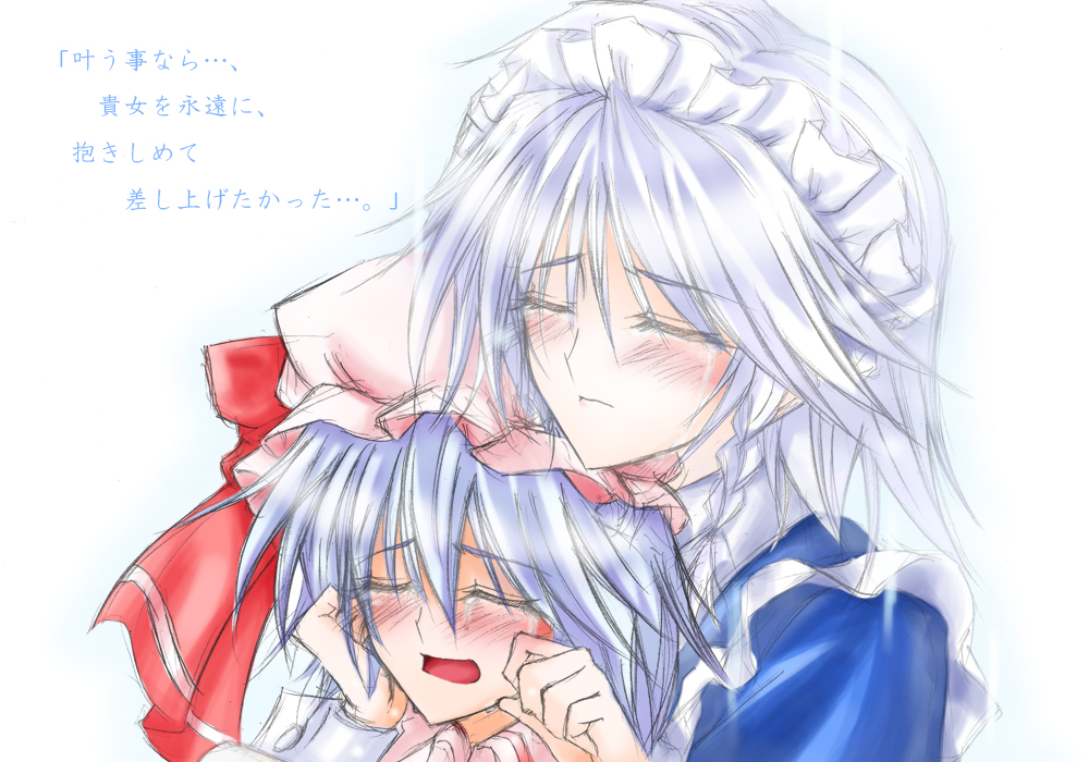 2girlsblue hairbraidclosed eyesfemale focusgradient backgroundhatmaidmultiple girlsshort hairtearsupper bodywhite background