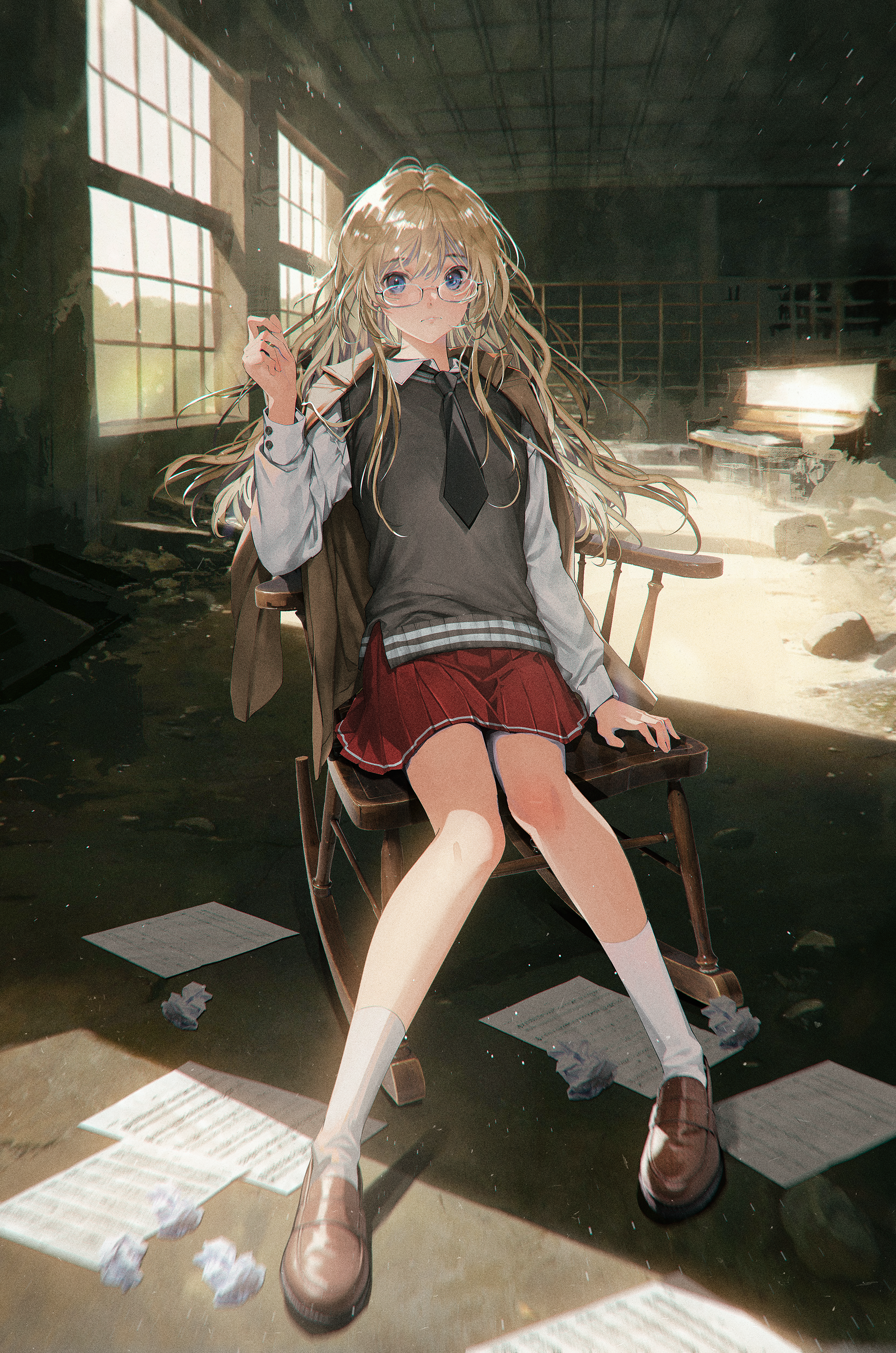 1girlblack necktieblonde hairblue eyesbrown jacketbrown shoeschairclosed mouthcrumpled paperdated commentaryfilm grainfrownfull bodygrey sweater vesthand upindoorsjacketknees together feet apartloaferslong hairlong sleeveslooking at viewerminiskirtnecktieon chairpaperparted bangspleated skirtred skirtrocking chairrubbleruinsschool uniformshirtshoessittingskirtsockssolostraight-onsweater vestunworn jacketwhite shirtwhite sockswindow shadowwooden chair