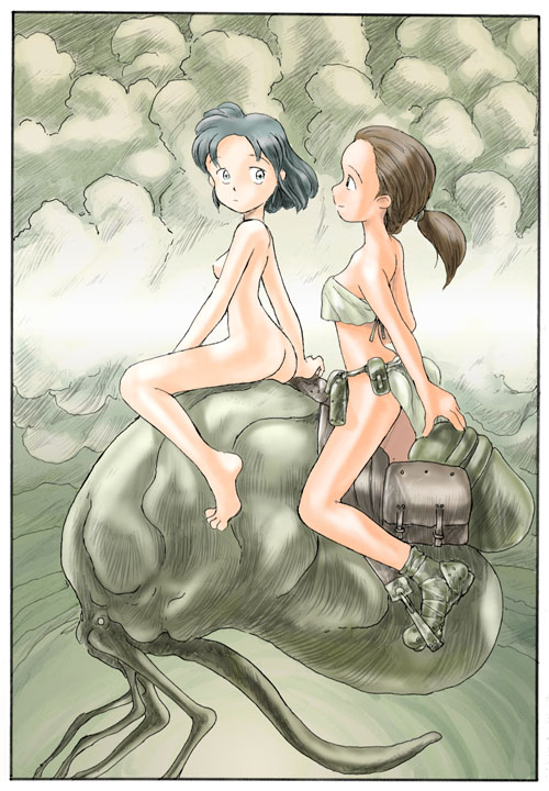 2girlsalienassbare armsbare legsbare shouldersbarefootblue eyesblue hairbootsborderbreastsbrown haircleavageclothed female nude femalecloudcloudy skycomiccompletely nudecreaturefeetfloatinglight smileloinclothlolilooking backmidriffmultiple girlsnavelnudeoutdoorspelvic curtainponytailridingshort hairskysmall breastsstirrups (riding)straplesstoeswhite borderzenra