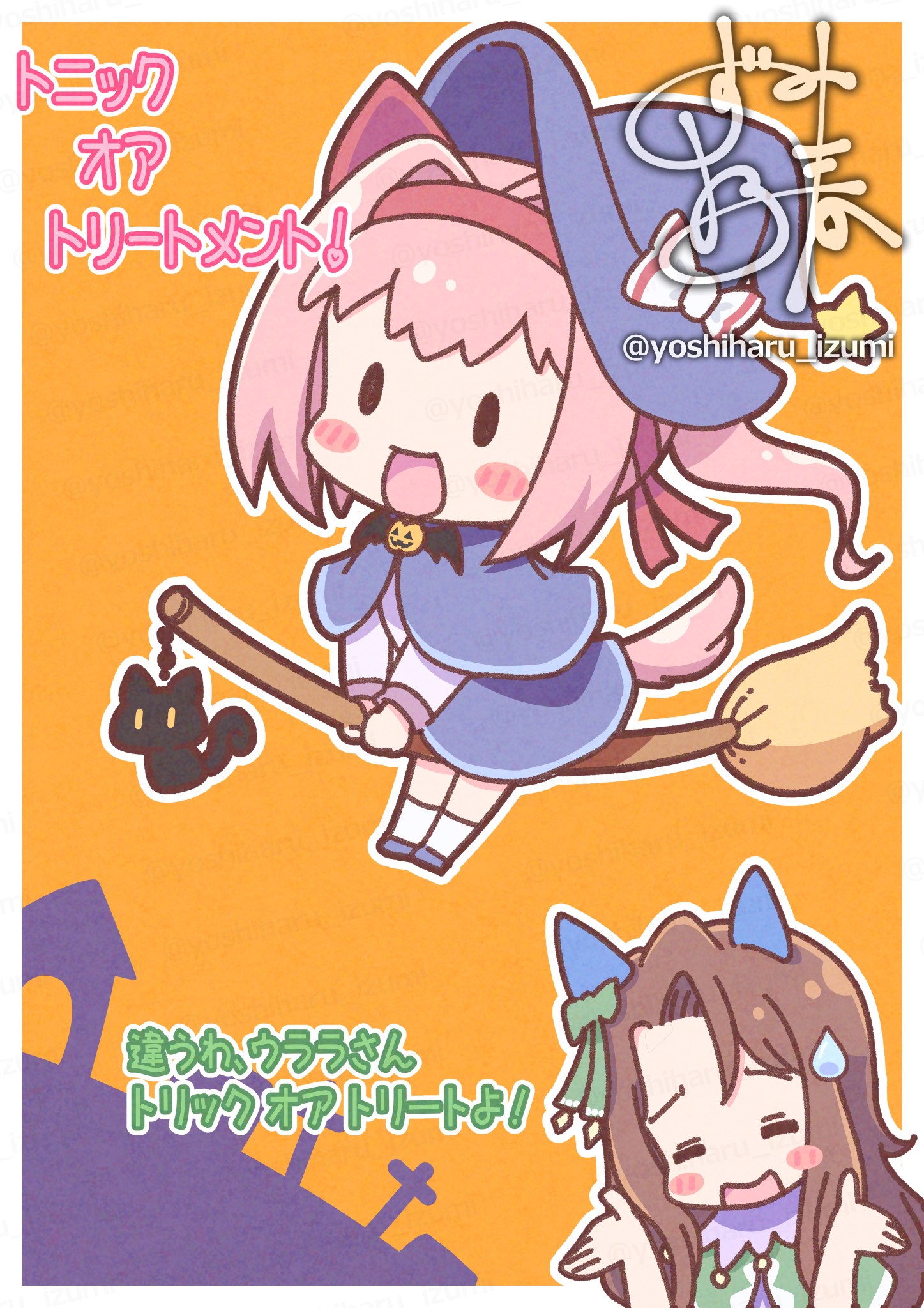 2girlsanimal earsblue capeletblue skirtblushblush stickersbowbreastsbroombroom ridingbrown haircapeletcharm (object)chibiclosed eyescostumeear bowear coversear ribbongreen bowgreen capelethairbandhalloweenhalloween costumehatheadbandhorse earshorse girlhorse taillong hairmultiple girlspink hairpink headbandponytailred headbandshirtskirtsmilesolid oval eyesstar (symbol)sweatdroptailwhite shirtwitchwitch hat