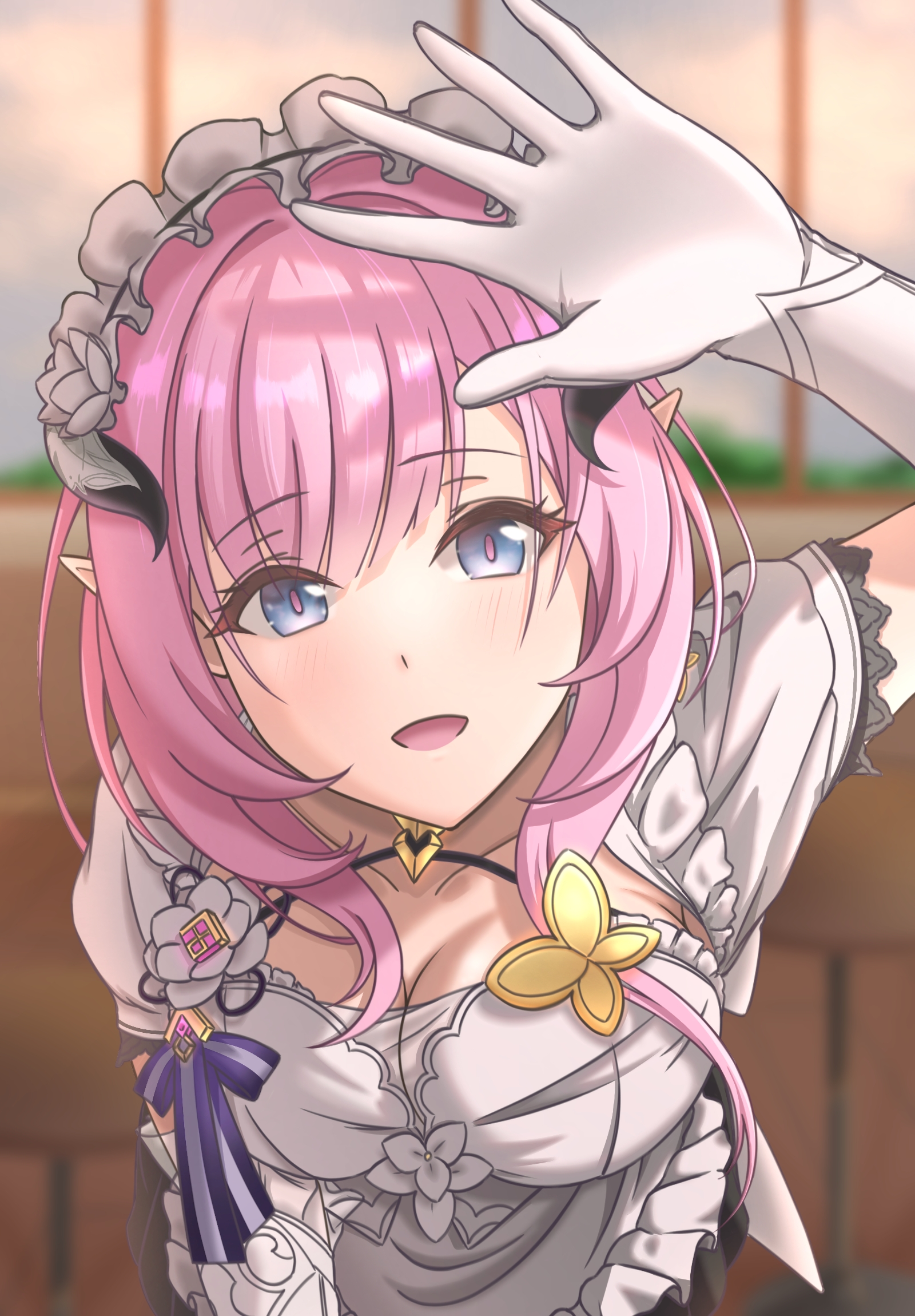 1girlapronarukoblue eyesbreastsbutterfly hair ornamentcleavageelffake hornsgloveshair ornamenthornsindoorslarge breastslong hairlooking at viewermaid apronmaid headdressofficial alternate costumeopen mouthpink hairpointy earssolovery long hairwhite apronwhite gloves