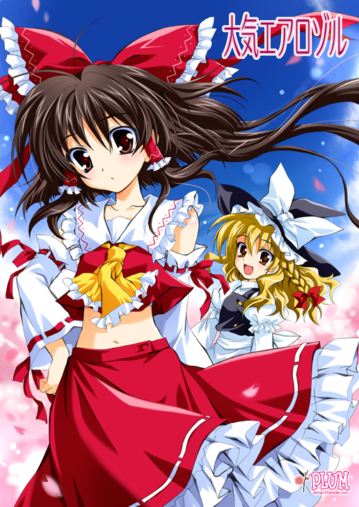 2girlsblonde hairbraidbrown eyesbrown hairdetached sleevesfemale focushatjapanese clothesmidriffmikomultiple girlsnaturenavelopen mouthoutdoorspetalsplantskirtskywindwitchwitch hatyellow eyes