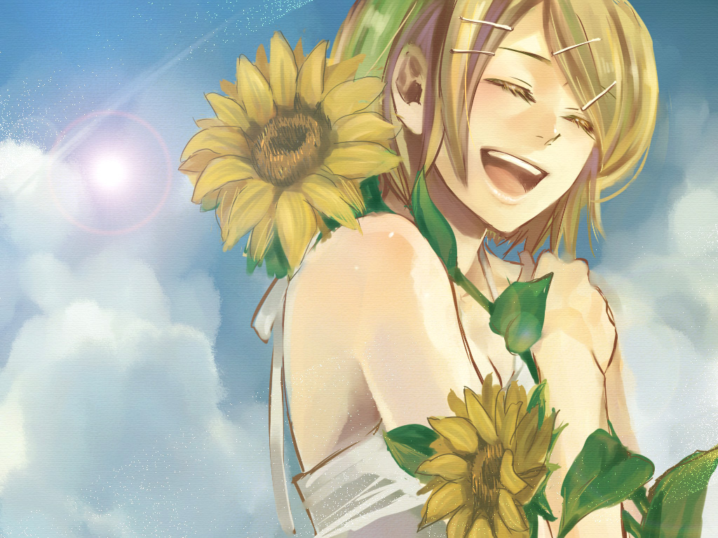 bare shouldersblonde hairclosed eyesflowerhair ornamenthaircliplens flareshort hairsolosunflower