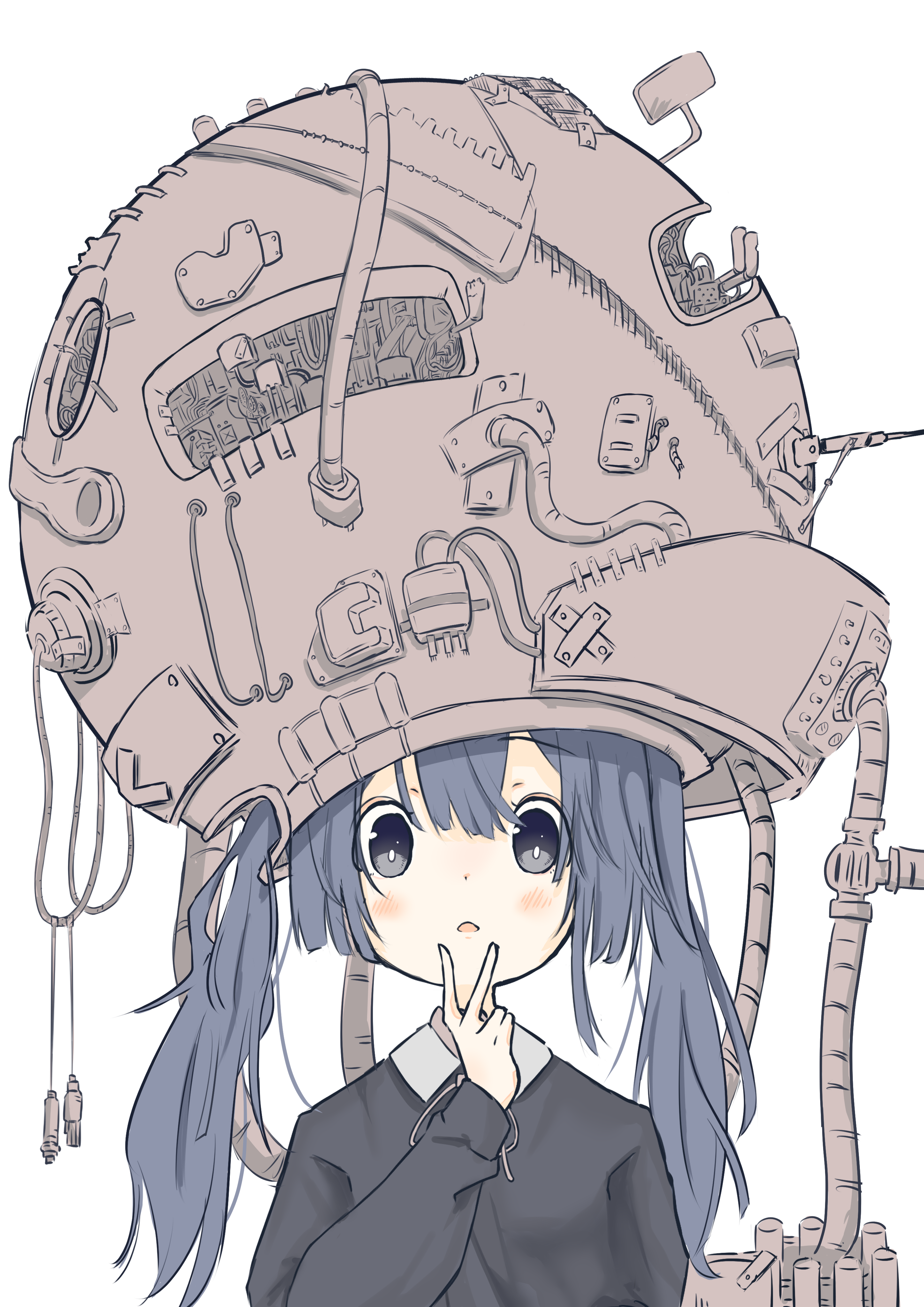 blue eyesblue haircollared shirthair between eyeslight blushlooking at viewermachineparted lipsshirtsolotwintailsupper bodyvwhite background