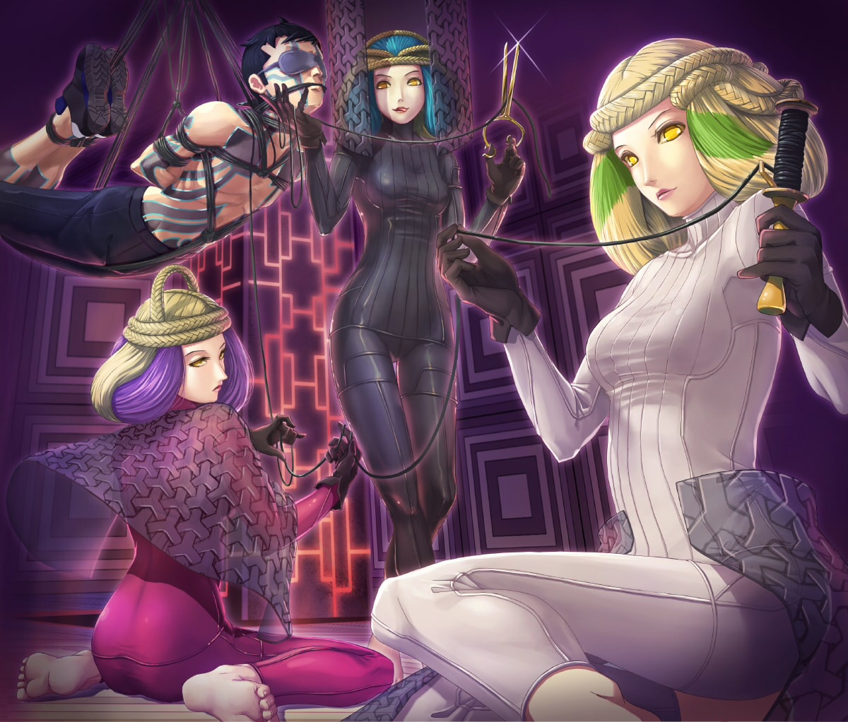 :p1boy3girlsbarefootbdsmblindfoldbodysuitbondageboundbraiddemon (megami tensei)feetfemdommultiple girlsropescissorsskin tightsolesspindletoestonguetongue outyellow eyes