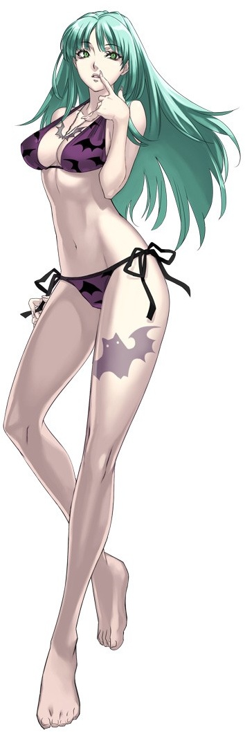 1girlalternate costumeanimal printaqua hairbarefootbat printbikinibreastscleavagedemon girlfeetfemale focusfinger to mouthfull bodygreen eyesgreen hairjewelrylarge breastslong hairlong legsmatching hair/eyesnecklacepale skinpointingprint bikiniside-tie bikini bottomsimple backgroundsolostandingswimsuittattoo