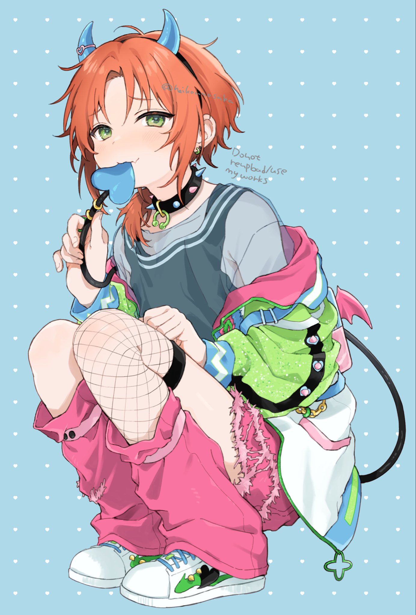 1boybackpackbagblack tank topblue backgroundblushbraceletcollardemon boydemon hornsdemon tailearringsfake hornsfangfishnetsfull bodygreen eyesheikounosabaholdingholding own tailhornsjacketjewelryleg warmerslong sleeveslooking at viewermale focusmulticolored jacketoff shoulderorange hairpink leg warmerssee-through clothessee-through shirtshirtshoesshortssneakerssolospiked collarspikessquattingtailtank toptorn clothestorn shortstrapwings