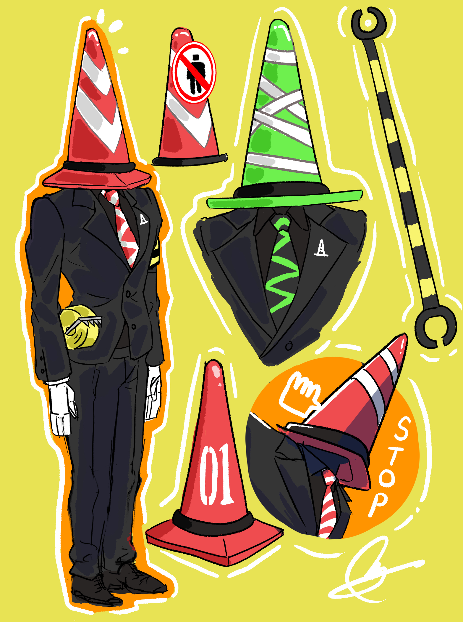2boysarmbandarms at sidesblack pantsblack shoesblack suitbuttonsdiagonal-striped clothesdiagonal-striped necktieformal clothesfull bodyglovesmale focusmultiple boysmultiple viewsnecktieobject headoshiro (oshiro 0203)outlinepantsred necktieroad signshoessignsignaturesimple backgroundsketchstandingstriped clothessuittraffic conetraffic cone on headwhite gloveswhite outlineyellow armbandyellow background