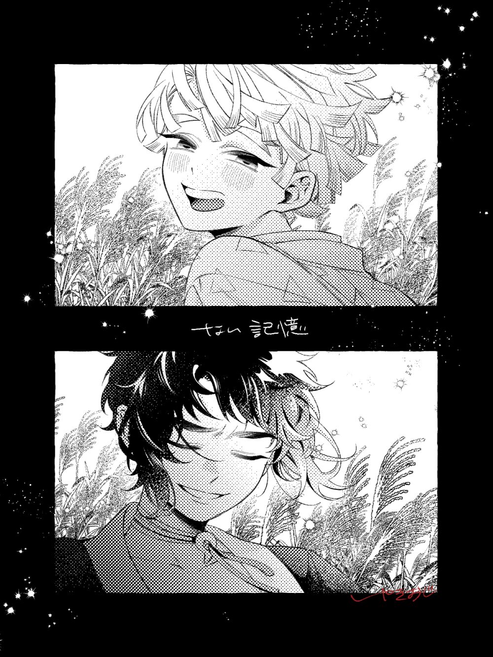 2boysclosed eyescollarbonegrassgreyscalegrinhalf-closed eyeshaorijapanese clotheslooking at viewermagatamamale focusmonochromemultiple boysoutdoorsprint haorishort hairsmilespiked hairtall grassteethtriangle printupper bodyupper teeth only