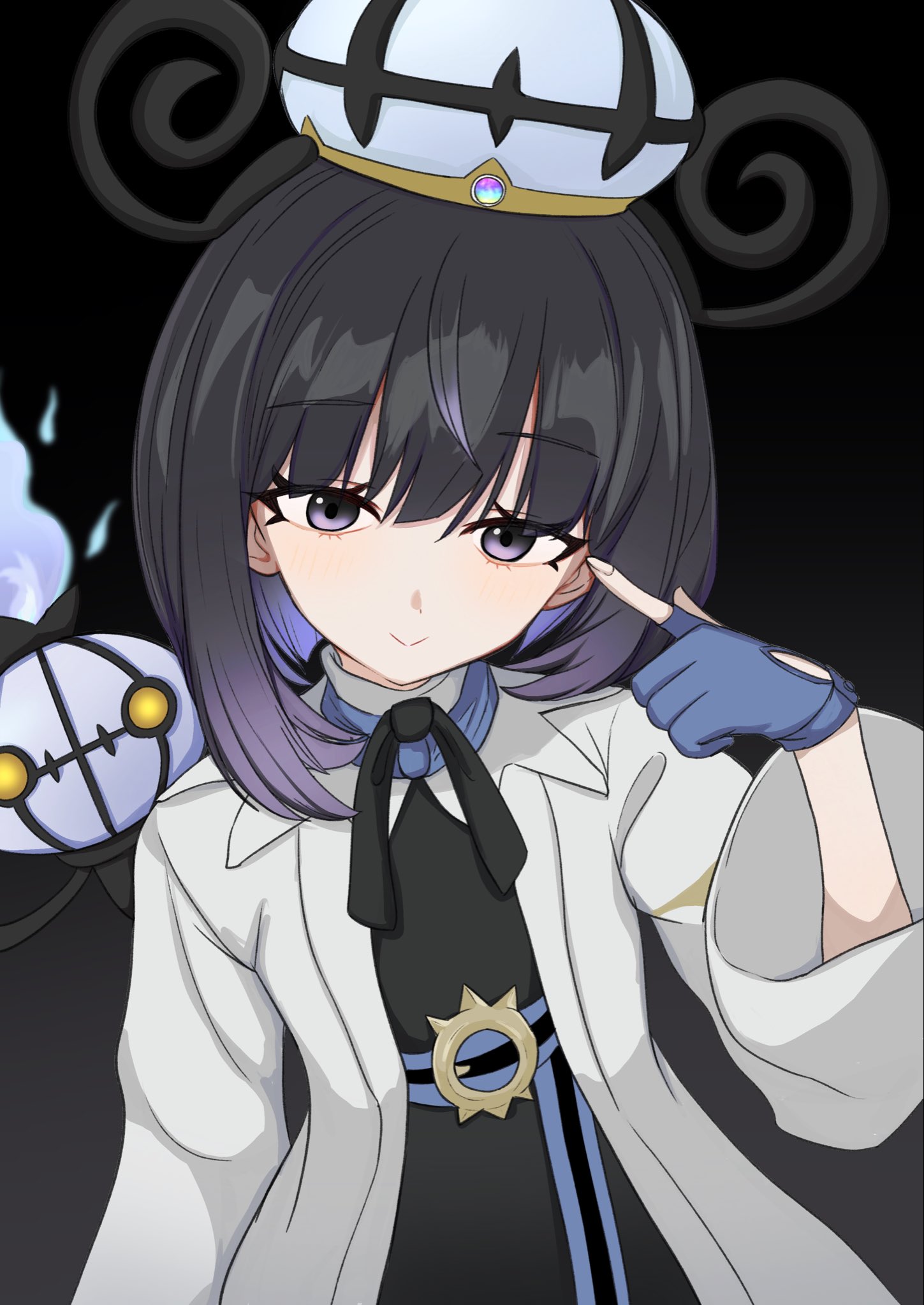 1girlbeltbelt buckleblack dressblack hairblue glovesbob cutbuckleclosed mouthcoatdresseyelashesgen 5 pokemonglovesgradient hairhatlong sleeveslooking at viewermega stonemulticolored hairo-ringo-ring beltopen clothesopen coatpartially fingerless glovespurple eyespurple hairshort hairsmilewhite coatwide sleeves