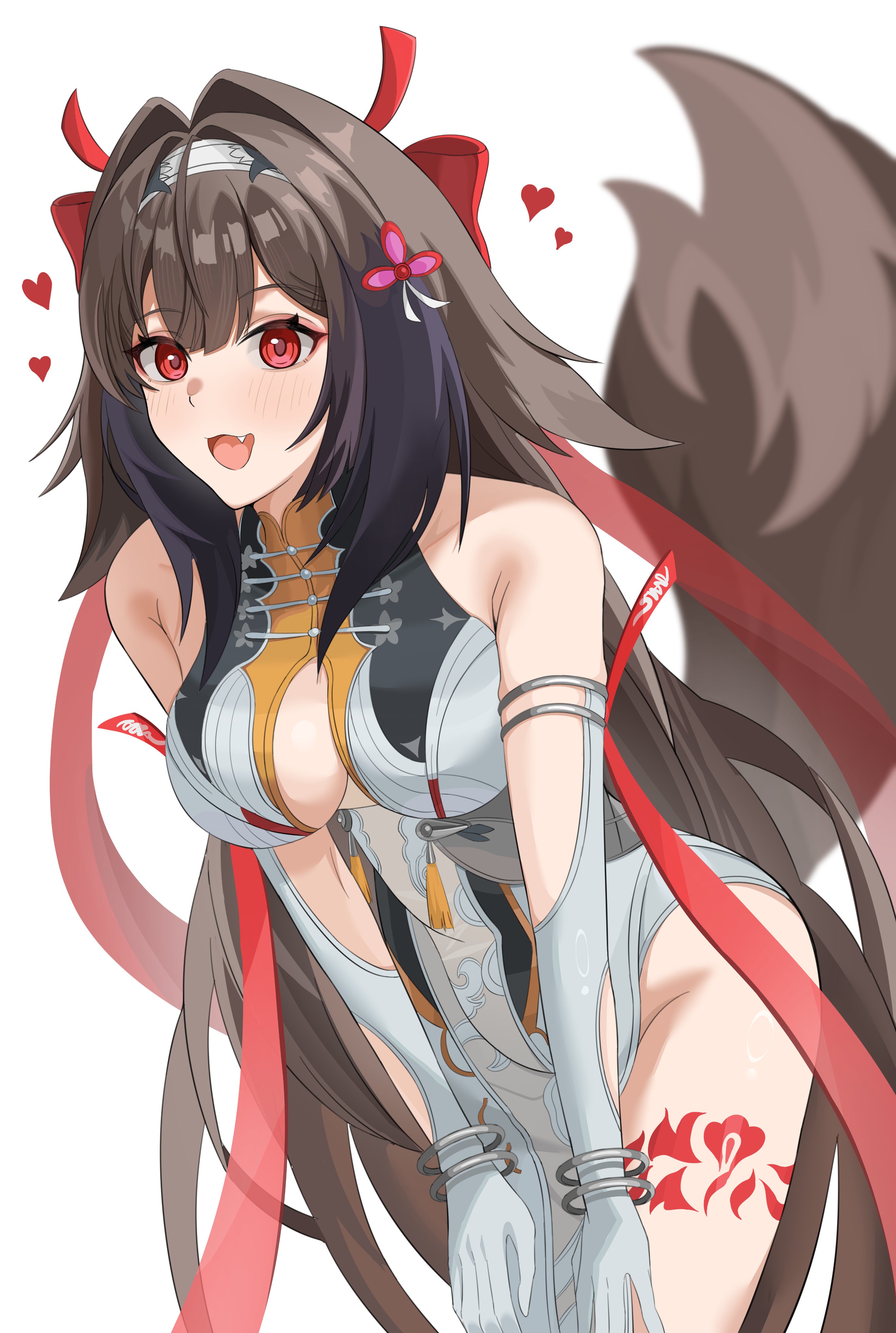 1girlaccessoriesarmletbare shouldersblurryblurry backgroundblushbraceletbreastsbrown hairbrown tailchina dresschinese clothescloverclover hair ornamentcowboy shotdressfanghair intakeshair ornamenthairbandhands on own legsheartjewelryleaning forwardleg tattoolong hairlong ribbonlooking at viewermedium breastsmetal braceletopen mouthred ribbonribbonsee-through clothessilver armletsilver braceletsimple backgroundsolotailtattoovery long hairwhite backgroundwhite hairband