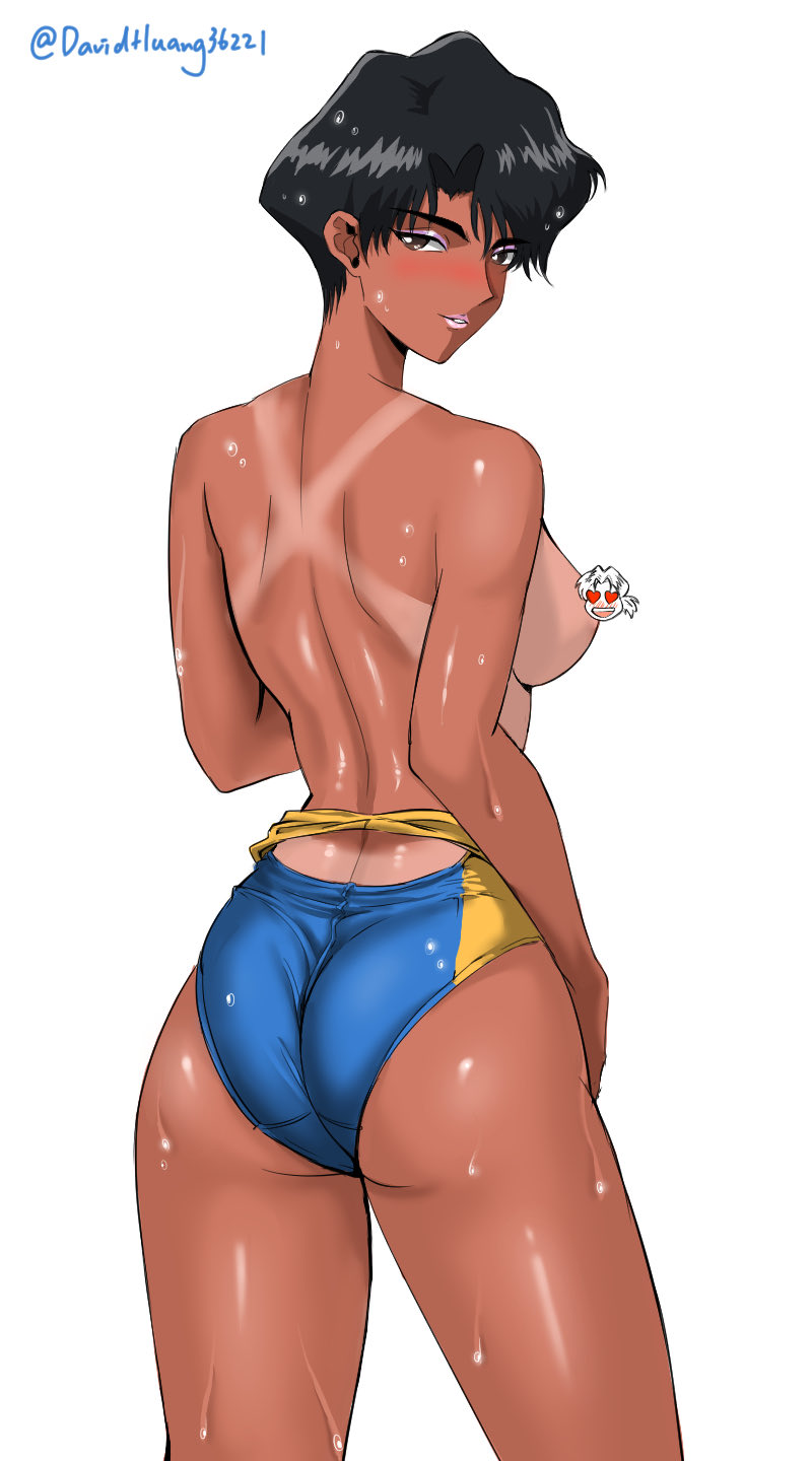 1girlassblack hairblue one-piece swimsuitbreastsbrown eyescompetition swimsuitdark skindark-skinned femalehighleghighleg one-piece swimsuitlooking at viewerlooking backone-piece swimsuitparted lipsshort hairsideboobsimple backgroundsoloswimsuittantanlinewhite background