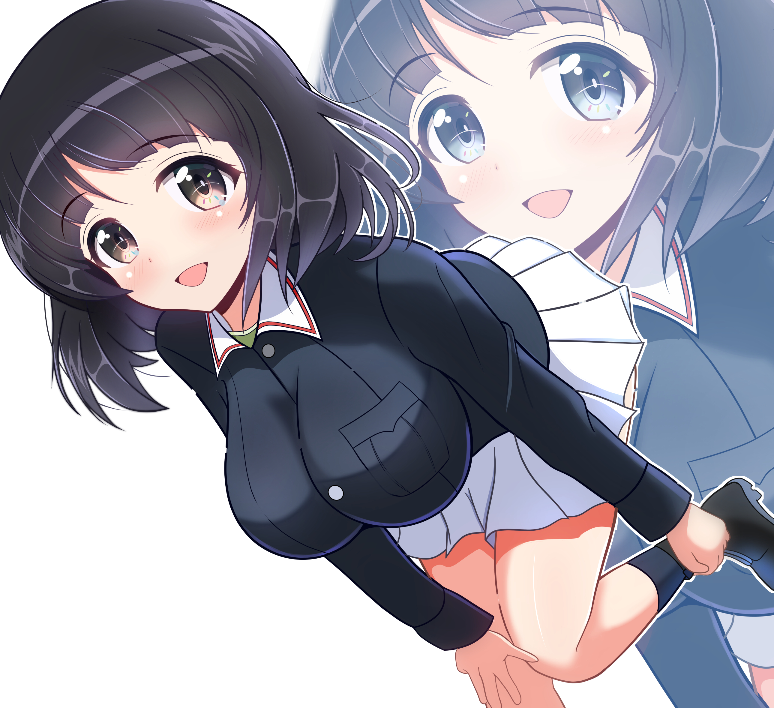 1girlblack hairblushbreastsbrown eyeslarge breastslooking at viewermilitary uniformooarai military uniformopen mouthshort hairsimple backgroundsmilesolowhite background